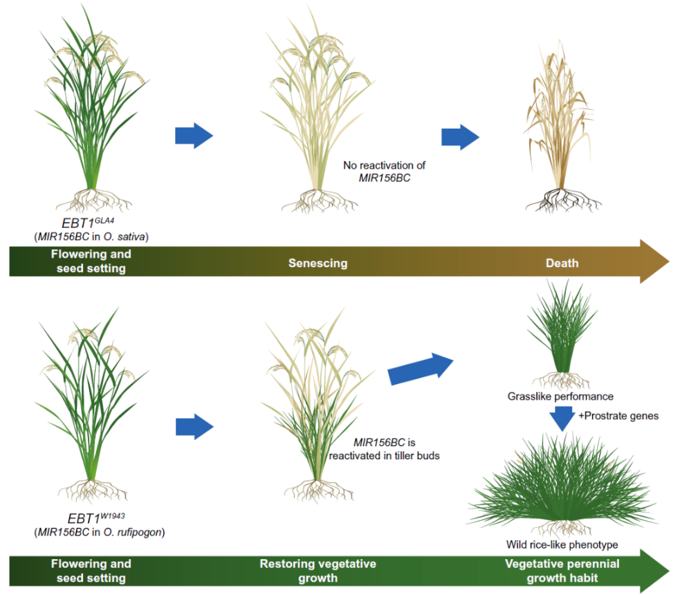 On March 20th, 2026 Beijing time, a research team led by Academician Han Bin from the National Key Laboratory of Plant Trait Formation and Improvement, the Center for Excellence in Molecular Plant Sciences, Chinese Academy of Sciences, and a team led by Principal Investigator Wang Jiawei from the CAS Key Laboratory of Plant High-Efficiency Carbon Fixation, published a paper online as the cover story in the internationally prestigious academic journal Science. The paper is titled “Resetting of a tandem microRNA156 enables vegetative perennial growth in rice”. This study marks the first cloning of EBT1, a key gene that determines the perennial growth habit of wild rice. It also clarifies that changes in the expression pattern of this gene locus were critical for the shift from perennial to annual growth during rice domestication.